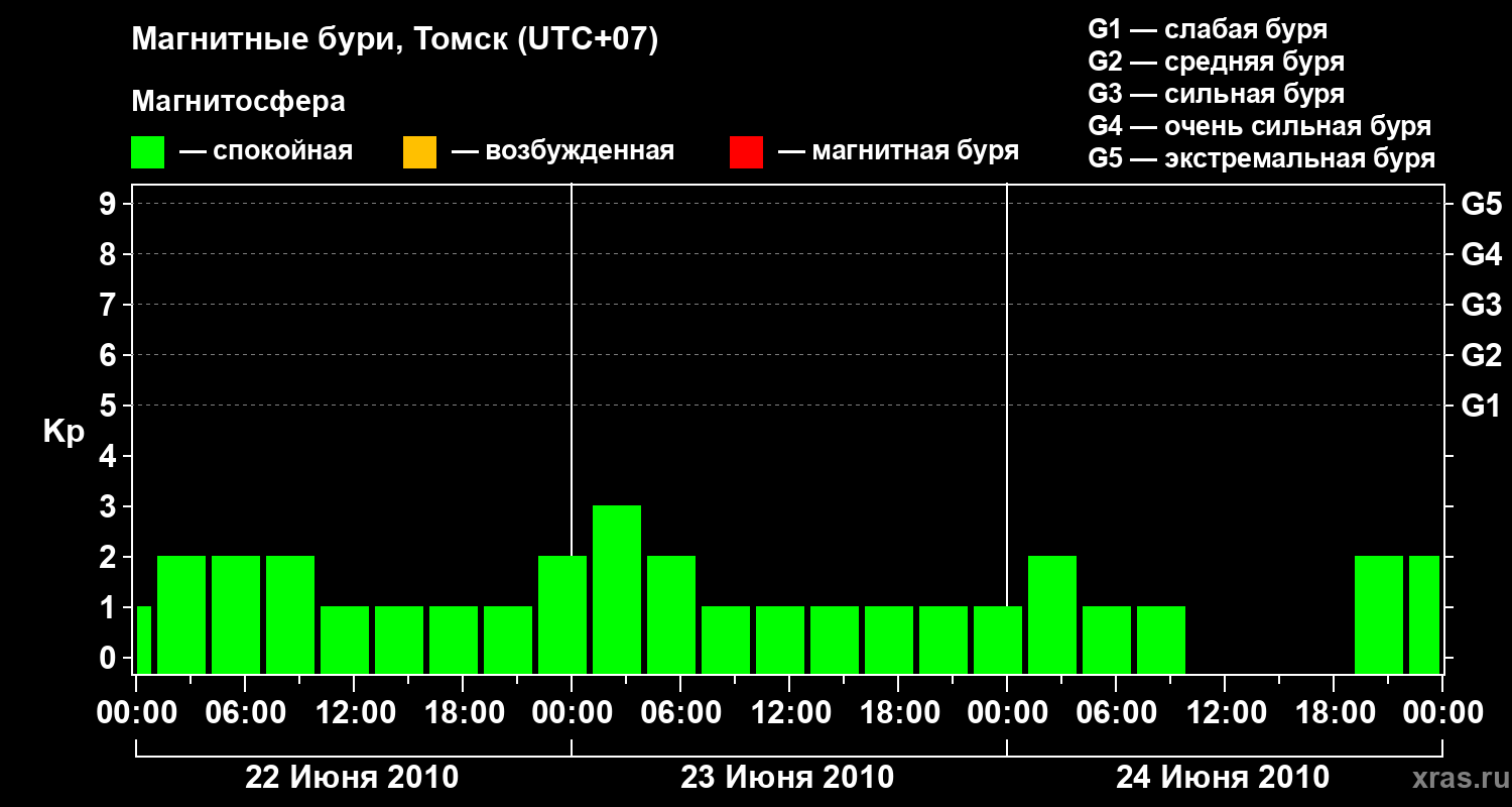 Изменения геомагнитного индекса Kp с 22 по 24 июня 2010 года для средних широт