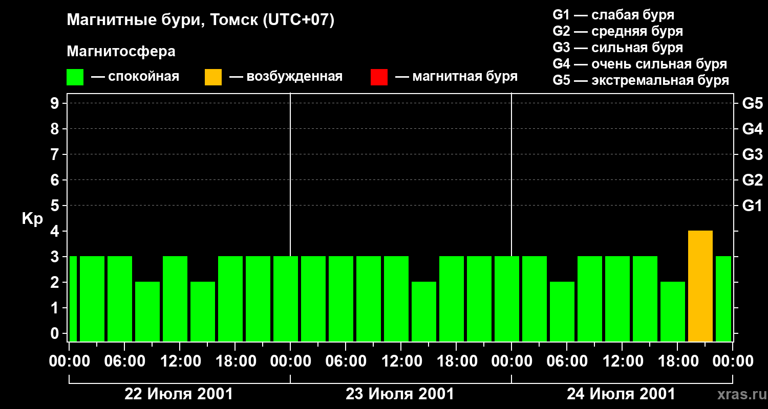 Изменения геомагнитного индекса Kp с 22 по 24 июля 2001 года для средних широт