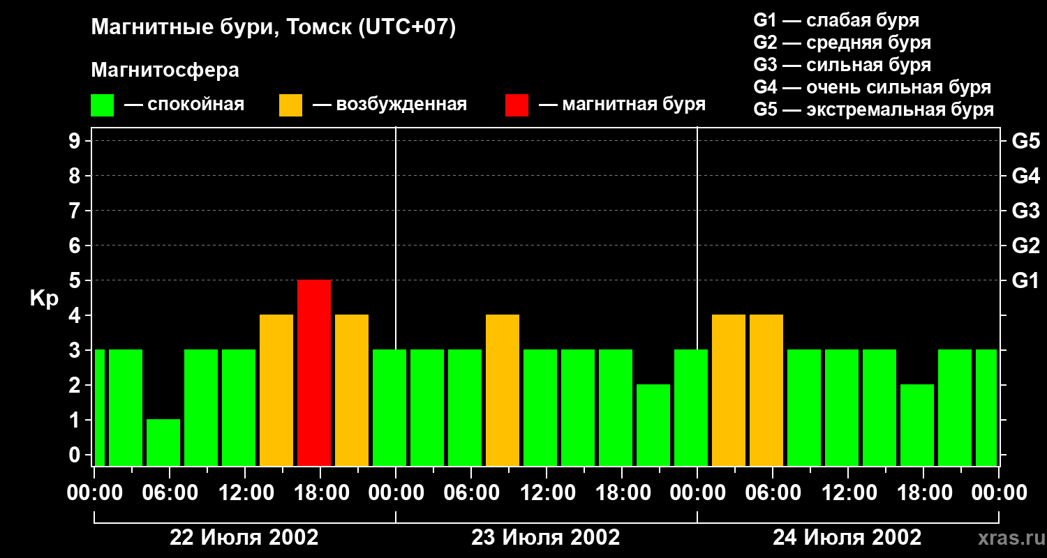 Изменения геомагнитного индекса Kp с 22 по 24 июля 2002 года для средних широт