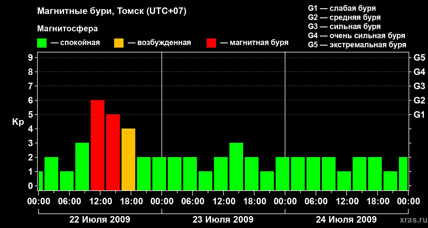 Изменения геомагнитного индекса Kp с 22 по 24 июля 2009 года для средних широт