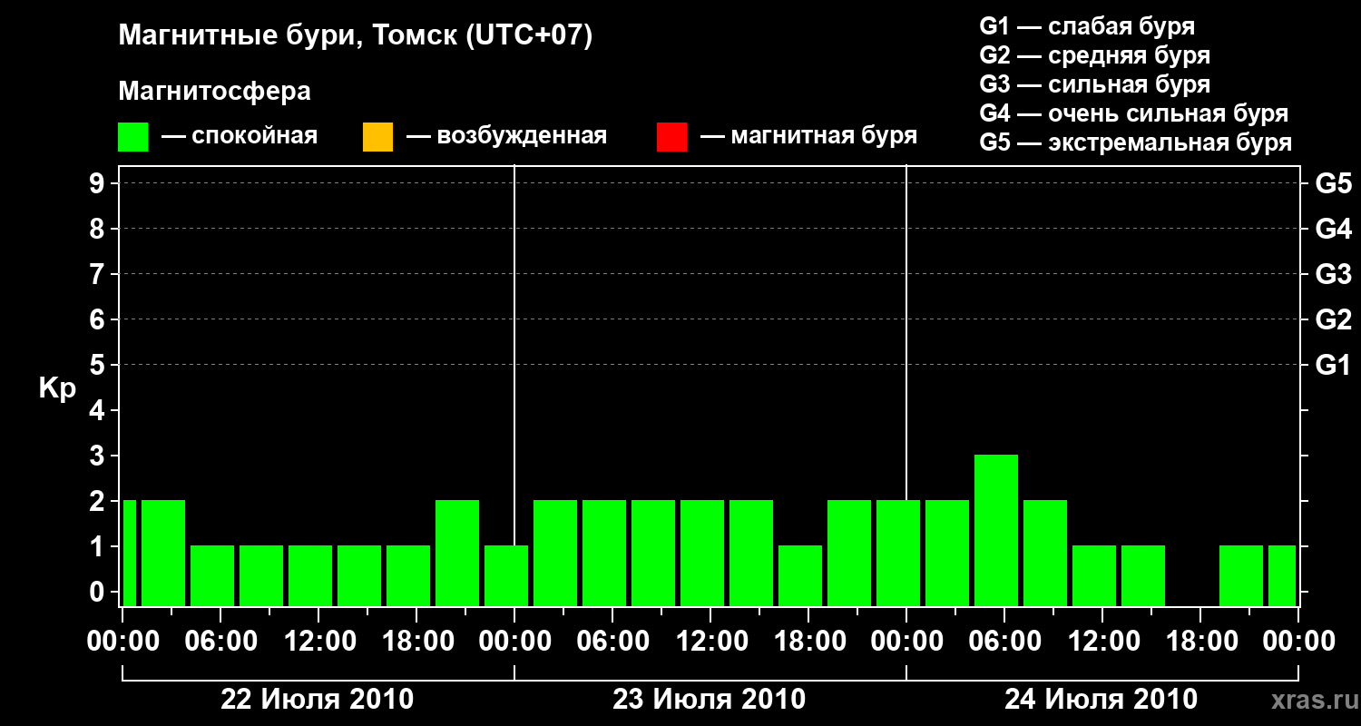 Изменения геомагнитного индекса Kp с 22 по 24 июля 2010 года для средних широт