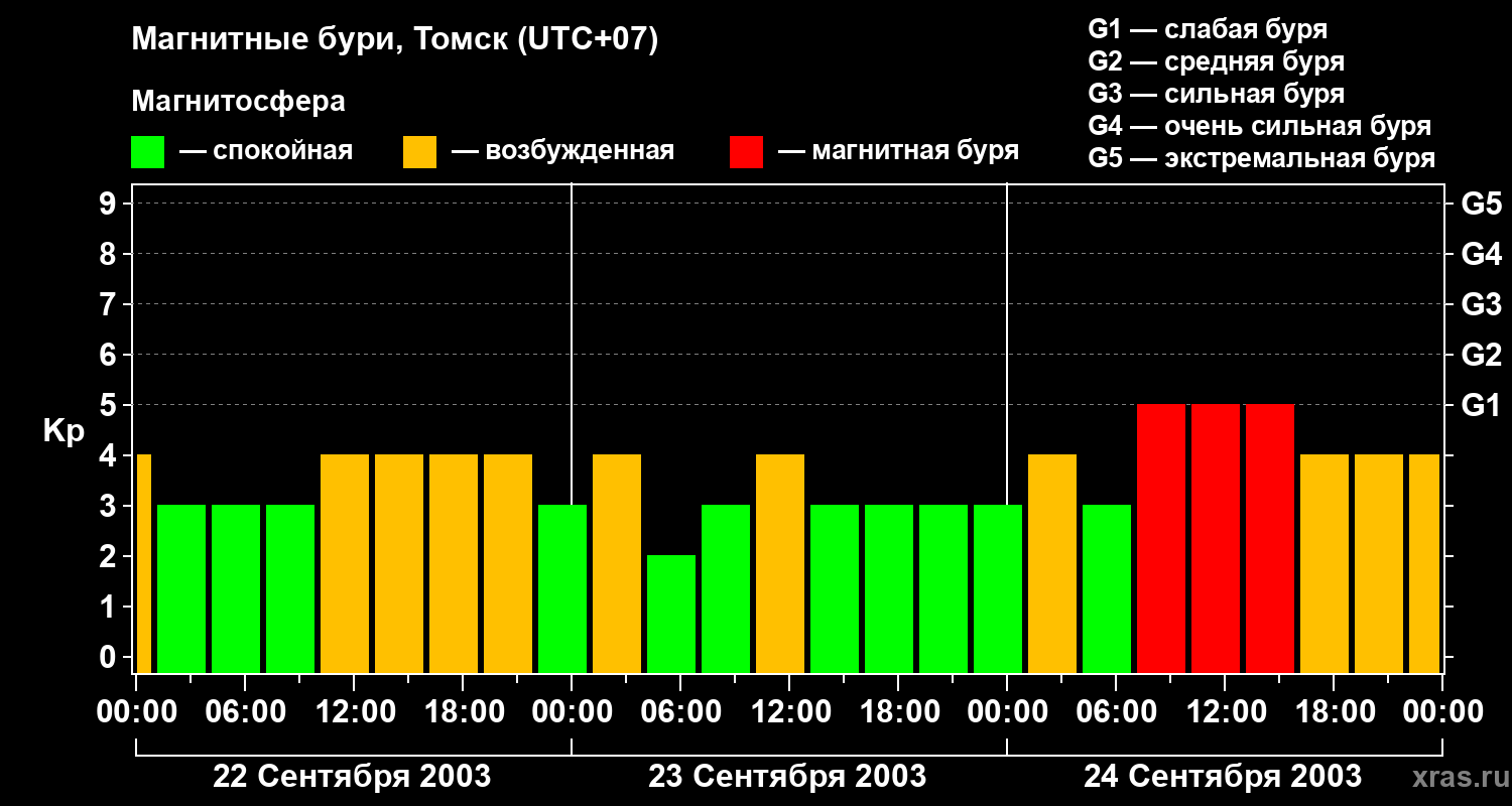 Изменения геомагнитного индекса Kp с 22 по 24 сентября 2003 года для средних широт