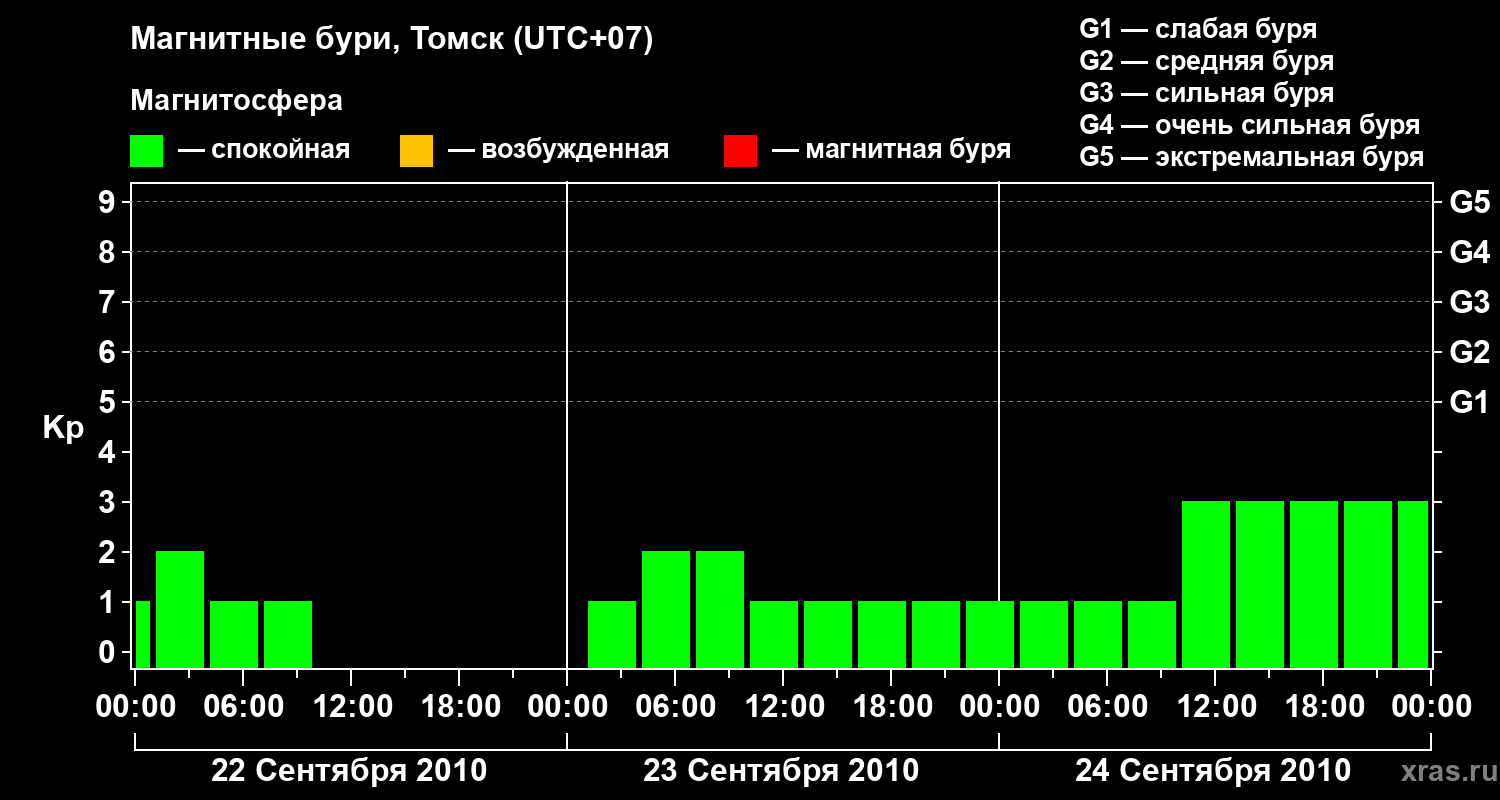 Изменения геомагнитного индекса Kp с 22 по 24 сентября 2010 года для средних широт