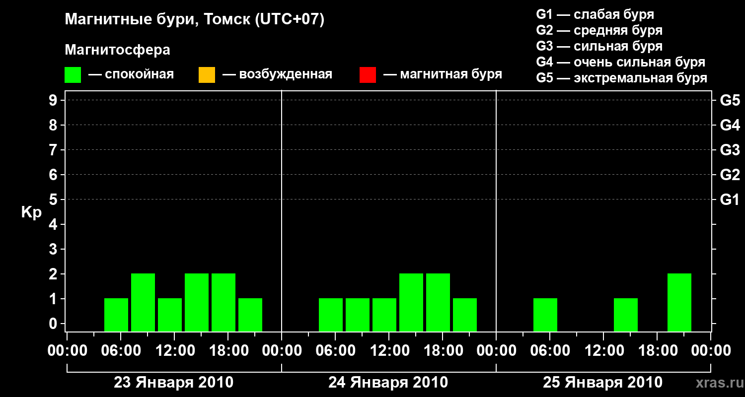 Изменения геомагнитного индекса Kp с 23 по 25 января 2010 года для средних широт