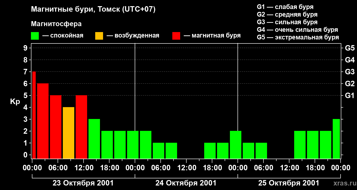 Изменения геомагнитного индекса Kp с 23 по 25 октября 2001 года для средних широт