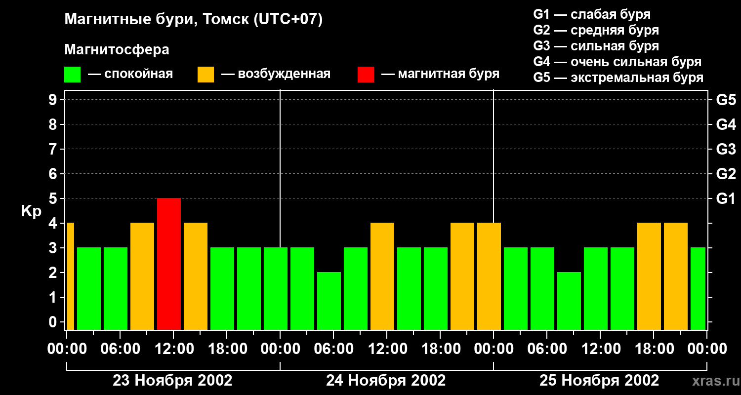 Изменения геомагнитного индекса Kp с 23 по 25 ноября 2002 года для средних широт