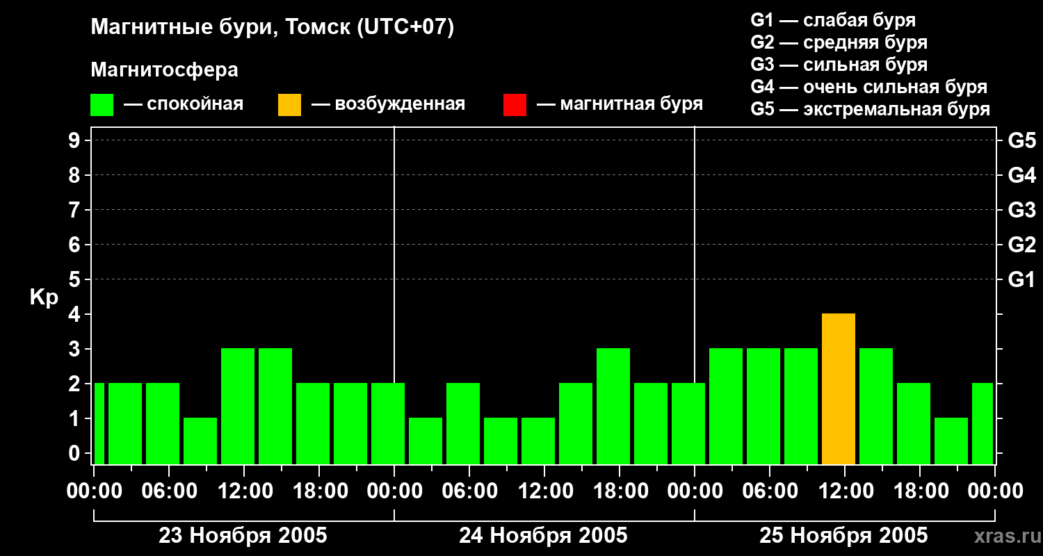 Изменения геомагнитного индекса Kp с 23 по 25 ноября 2005 года для средних широт