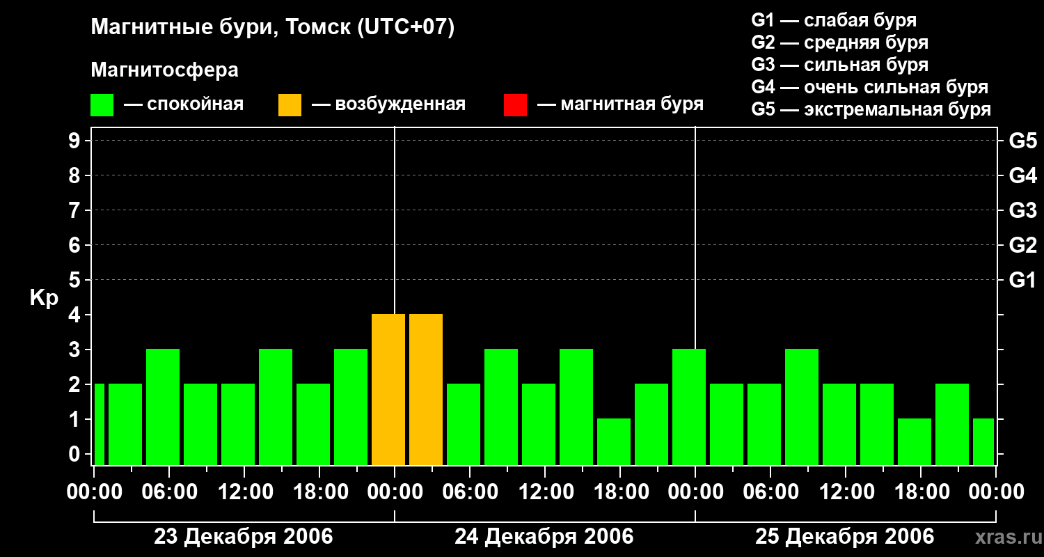 Изменения геомагнитного индекса Kp с 23 по 25 декабря 2006 года для средних широт