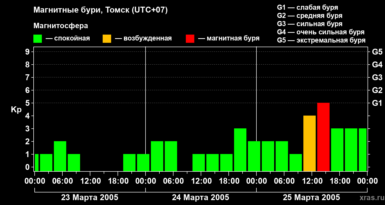 Изменения геомагнитного индекса Kp с 23 по 25 марта 2005 года для средних широт