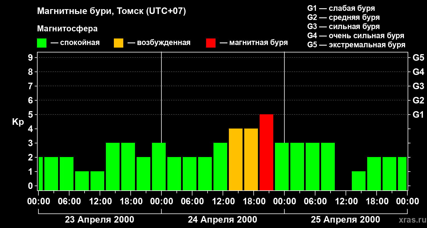 Изменения геомагнитного индекса Kp с 23 по 25 апреля 2000 года для средних широт