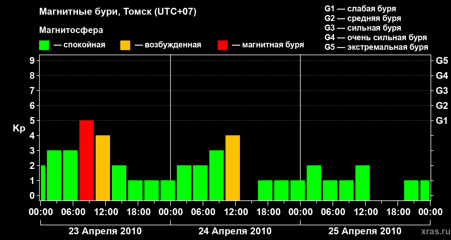 Изменения геомагнитного индекса Kp с 23 по 25 апреля 2010 года для средних широт