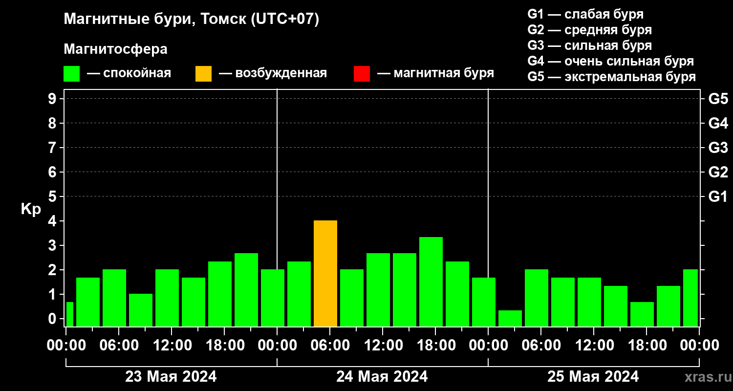 Изменения геомагнитного индекса Kp с 23 по 25 мая 2024 года для средних широт