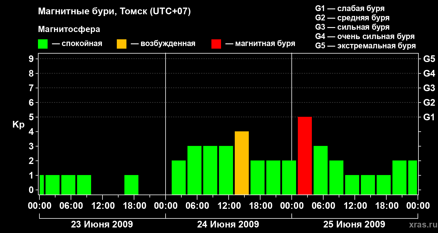 Изменения геомагнитного индекса Kp с 23 по 25 июня 2009 года для средних широт