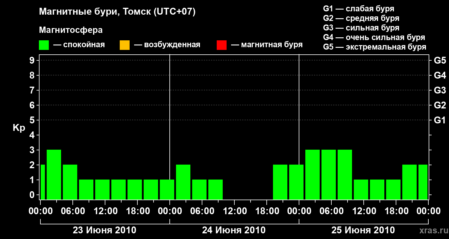 Изменения геомагнитного индекса Kp с 23 по 25 июня 2010 года для средних широт