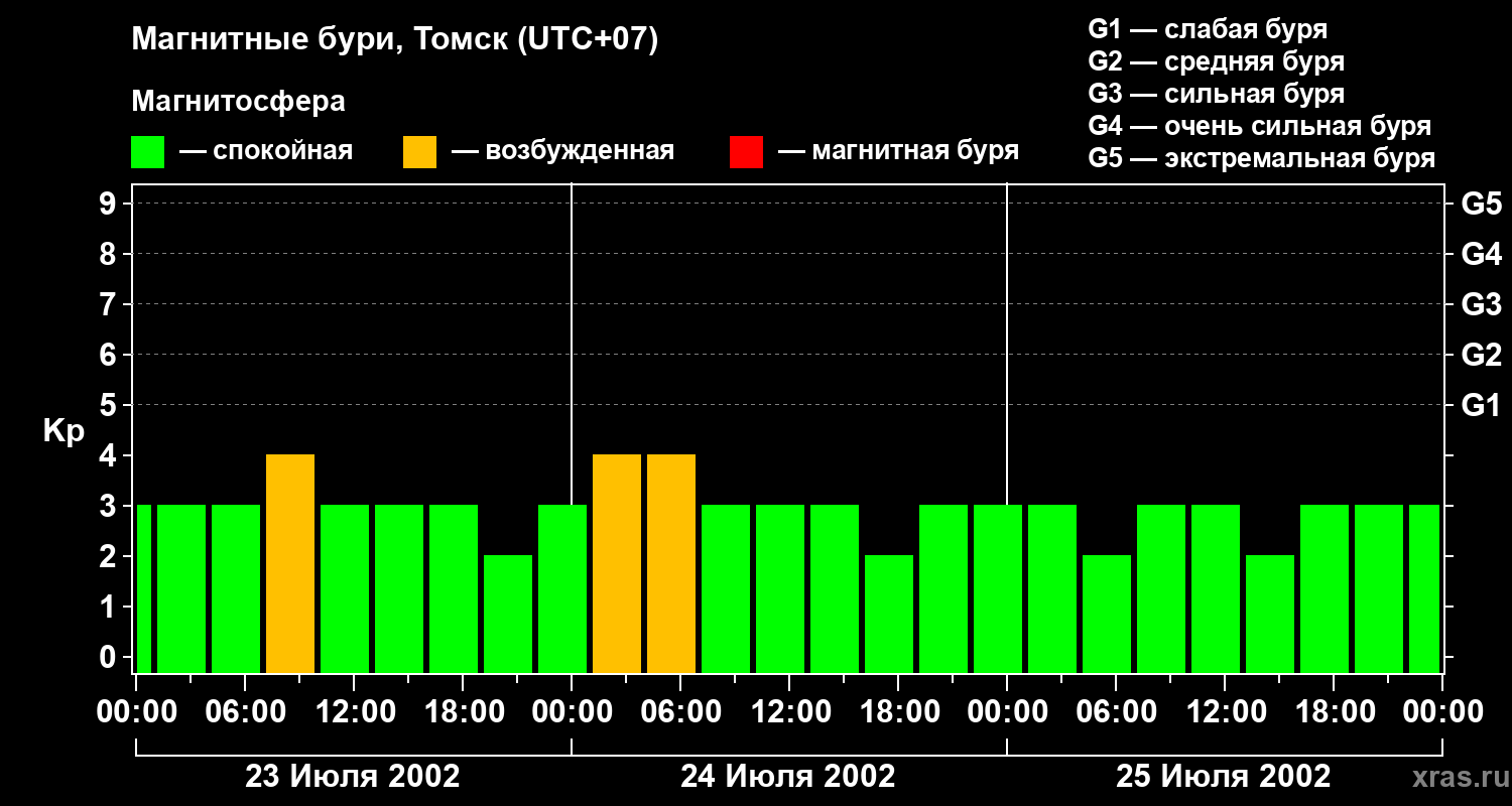 Изменения геомагнитного индекса Kp с 23 по 25 июля 2002 года для средних широт