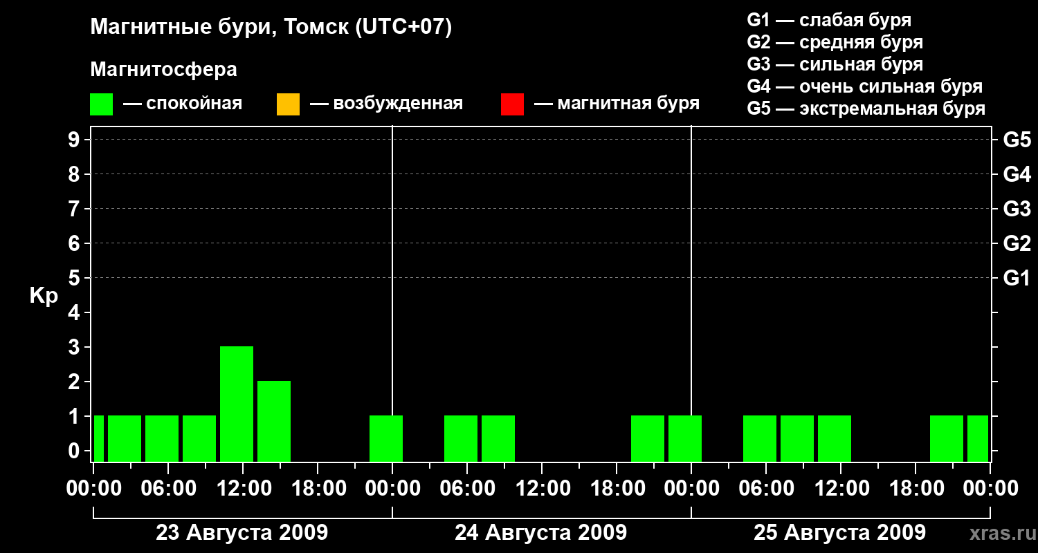 Изменения геомагнитного индекса Kp с 23 по 25 августа 2009 года для средних широт