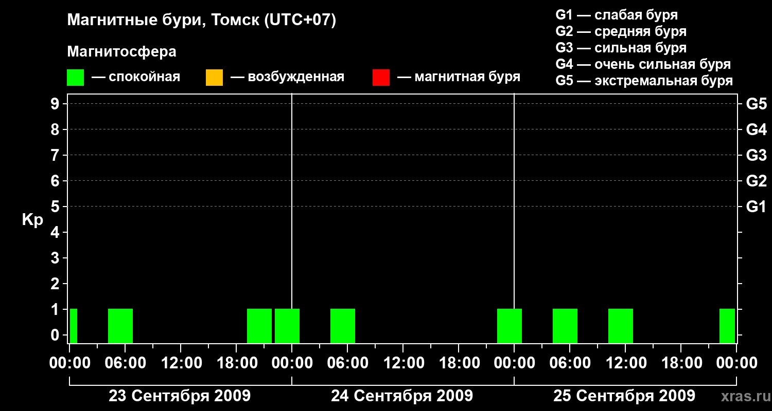 Изменения геомагнитного индекса Kp с 23 по 25 сентября 2009 года для средних широт