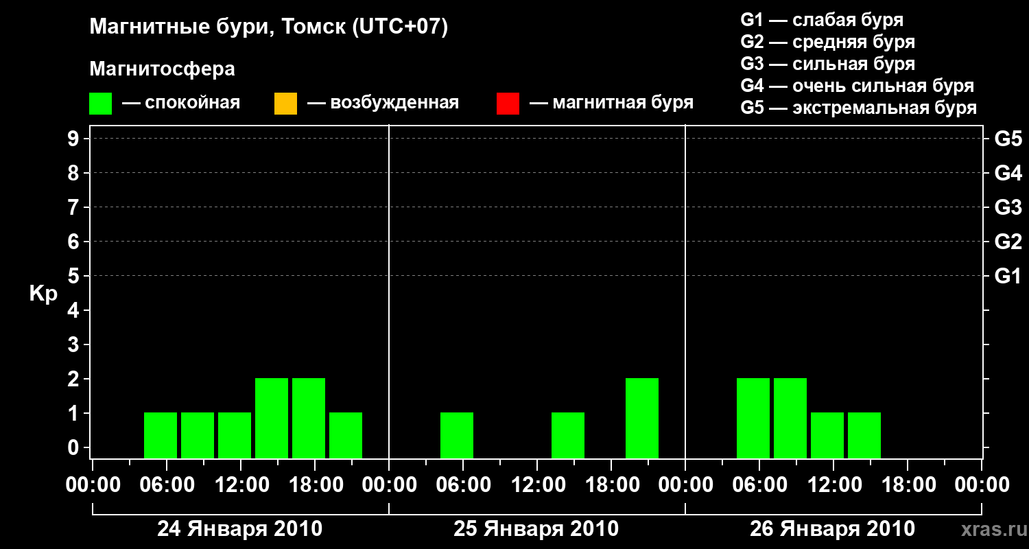 Изменения геомагнитного индекса Kp с 24 по 26 января 2010 года для средних широт
