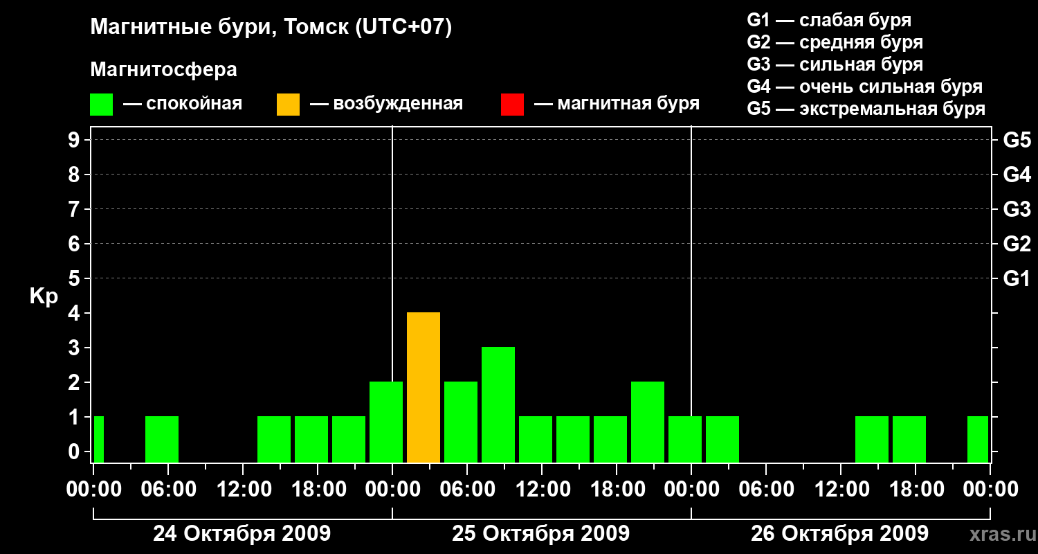 Изменения геомагнитного индекса Kp с 24 по 26 октября 2009 года для средних широт
