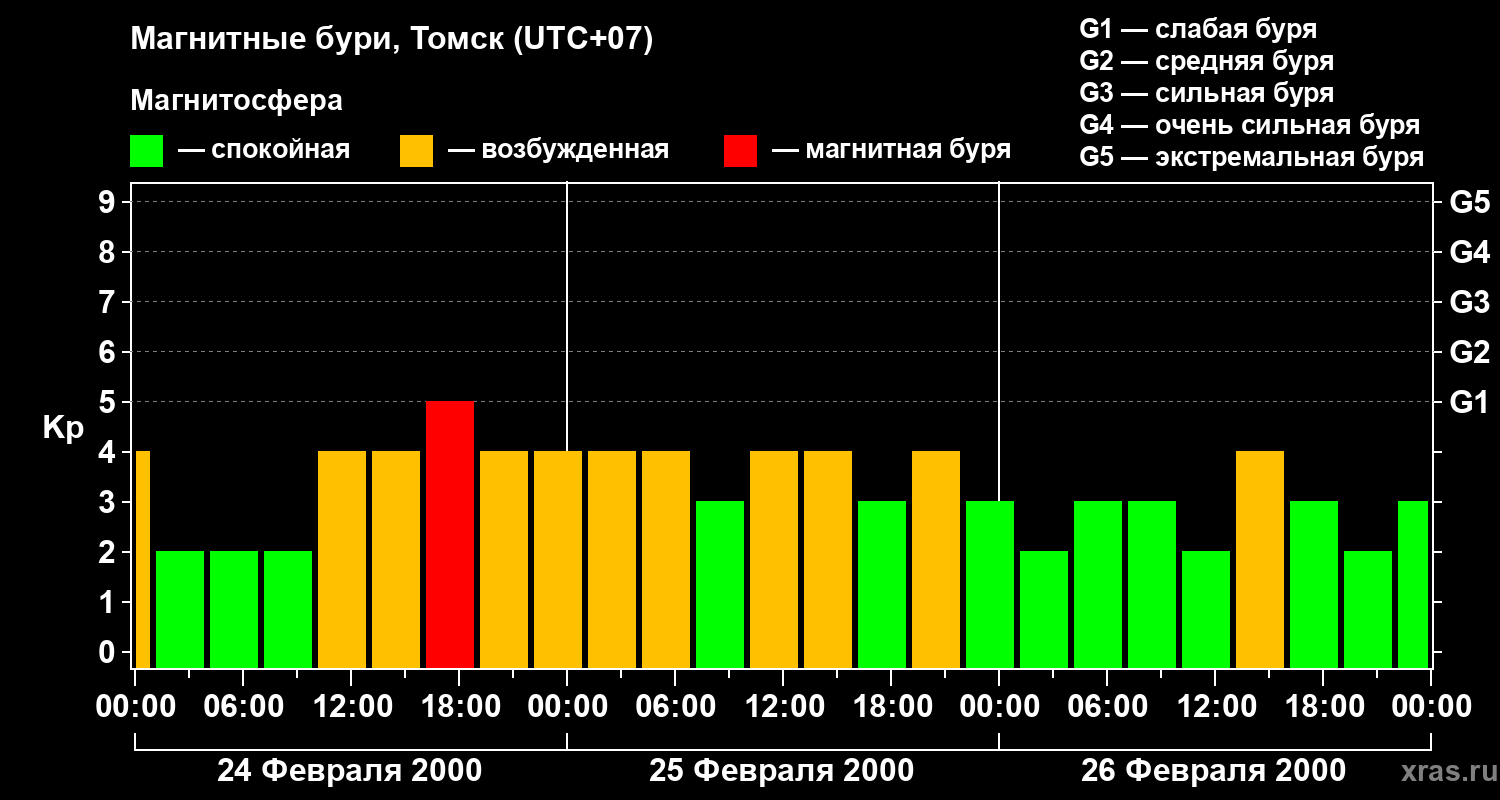 Изменения геомагнитного индекса Kp с 24 по 26 февраля 2000 года для средних широт