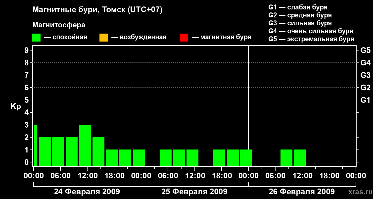 Изменения геомагнитного индекса Kp с 24 по 26 февраля 2009 года для средних широт