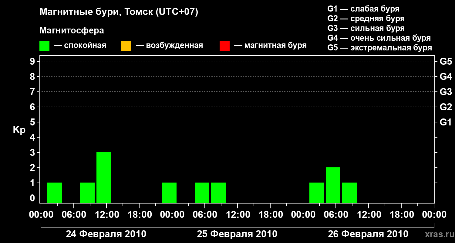 Изменения геомагнитного индекса Kp с 24 по 26 февраля 2010 года для средних широт