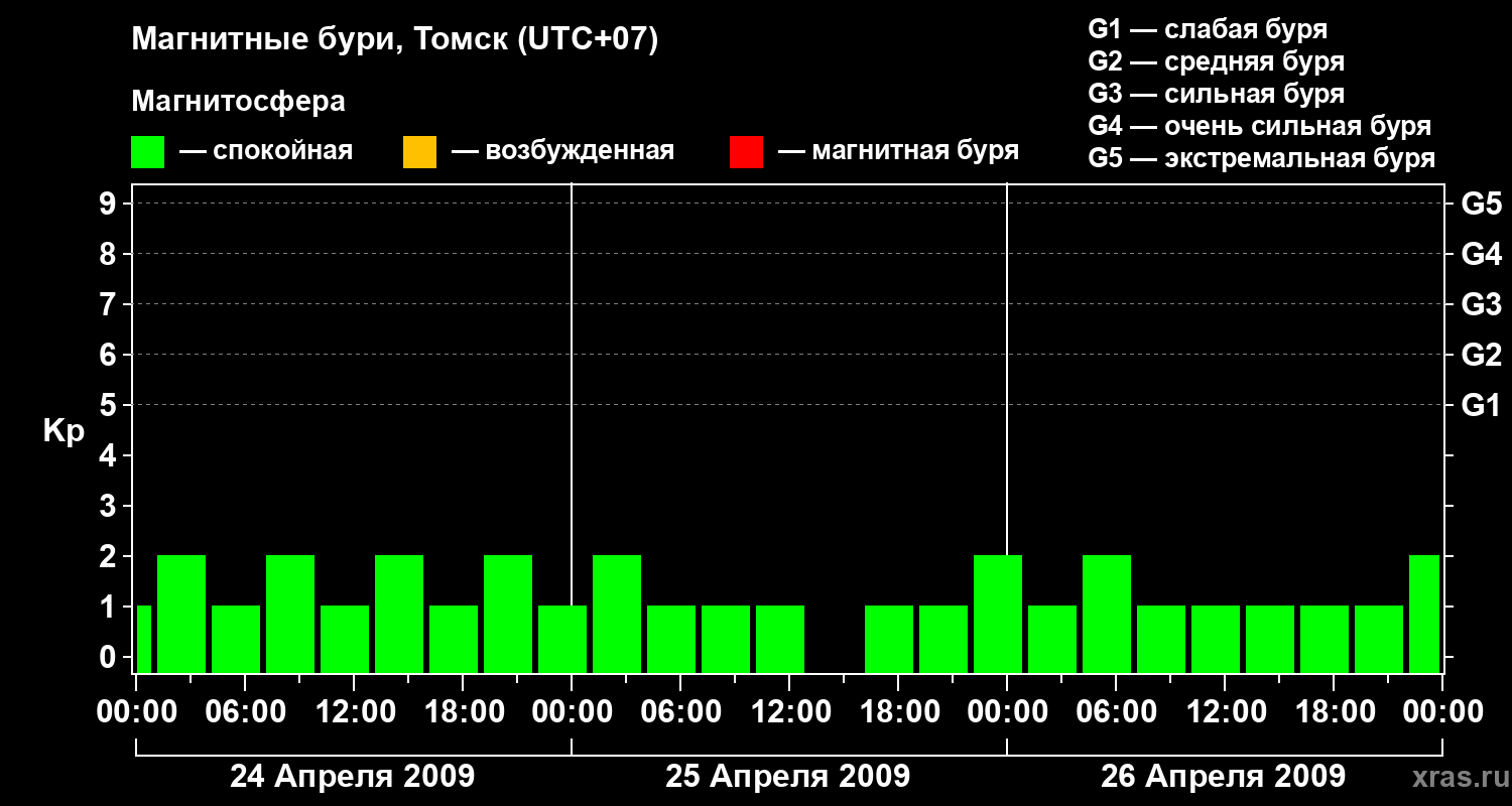 Изменения геомагнитного индекса Kp с 24 по 26 апреля 2009 года для средних широт
