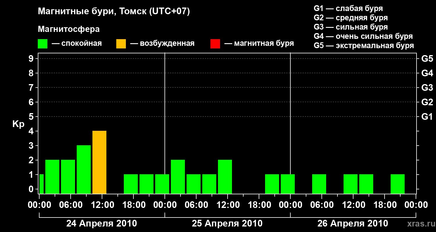 Изменения геомагнитного индекса Kp с 24 по 26 апреля 2010 года для средних широт