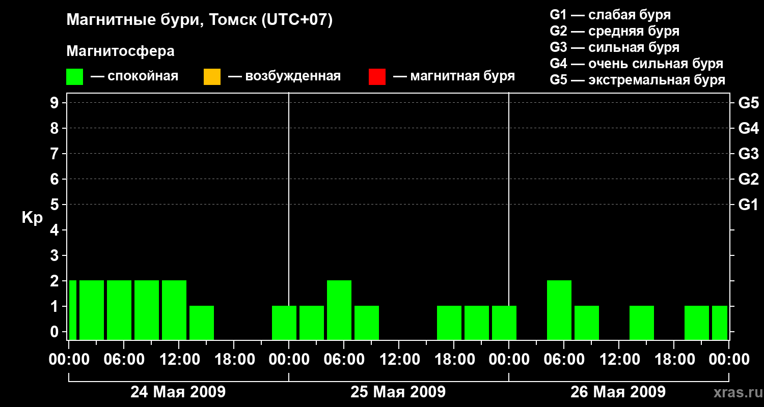 Изменения геомагнитного индекса Kp с 24 по 26 мая 2009 года для средних широт