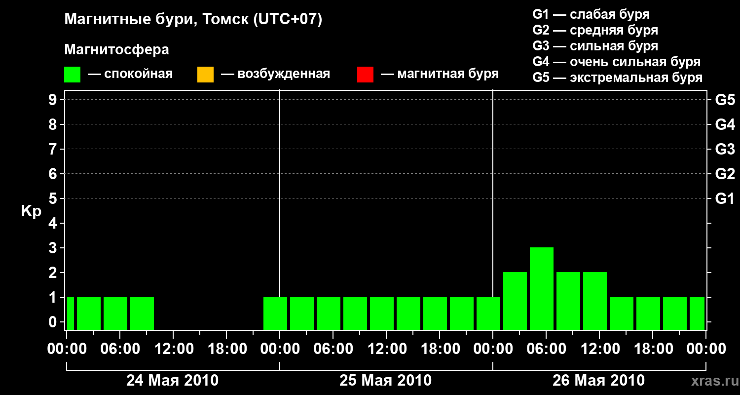 Изменения геомагнитного индекса Kp с 24 по 26 мая 2010 года для средних широт