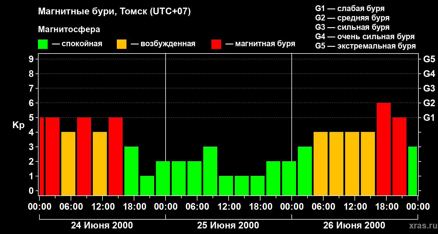 Изменения геомагнитного индекса Kp с 24 по 26 июня 2000 года для средних широт