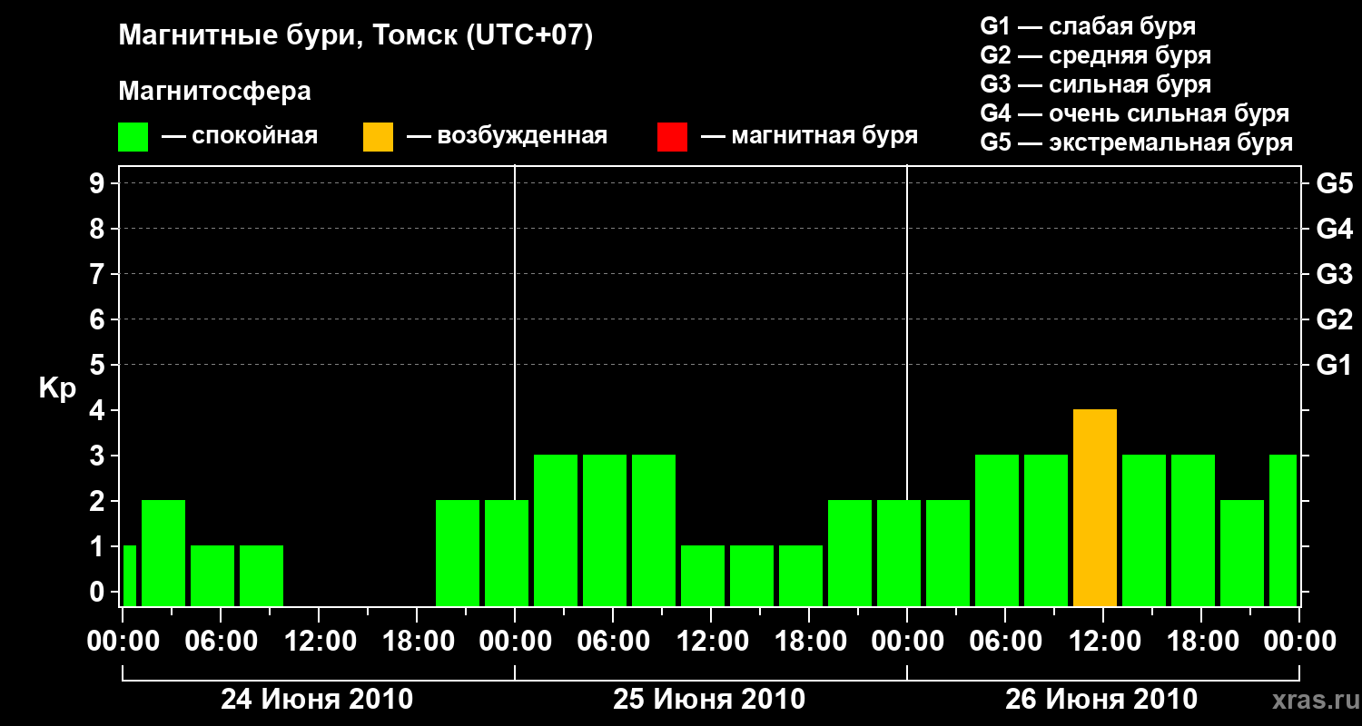 Изменения геомагнитного индекса Kp с 24 по 26 июня 2010 года для средних широт
