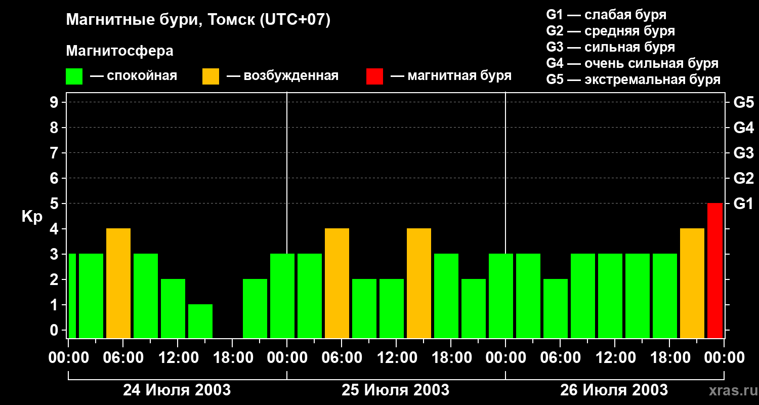 Изменения геомагнитного индекса Kp с 24 по 26 июля 2003 года для средних широт