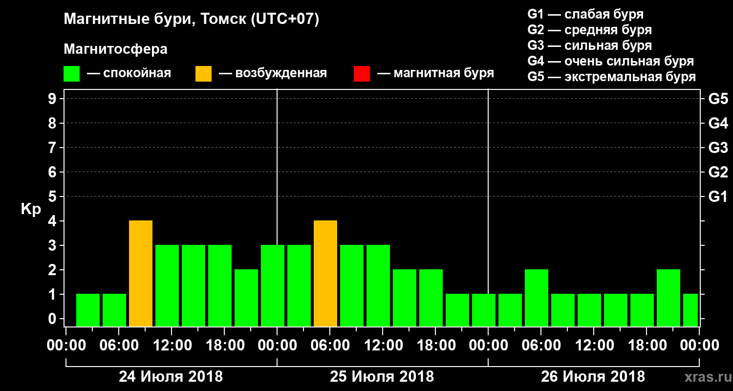 Изменения геомагнитного индекса Kp с 24 по 26 июля 2018 года для средних широт