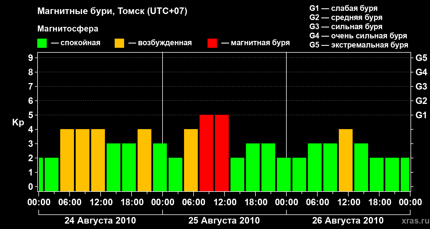 Изменения геомагнитного индекса Kp с 24 по 26 августа 2010 года для средних широт