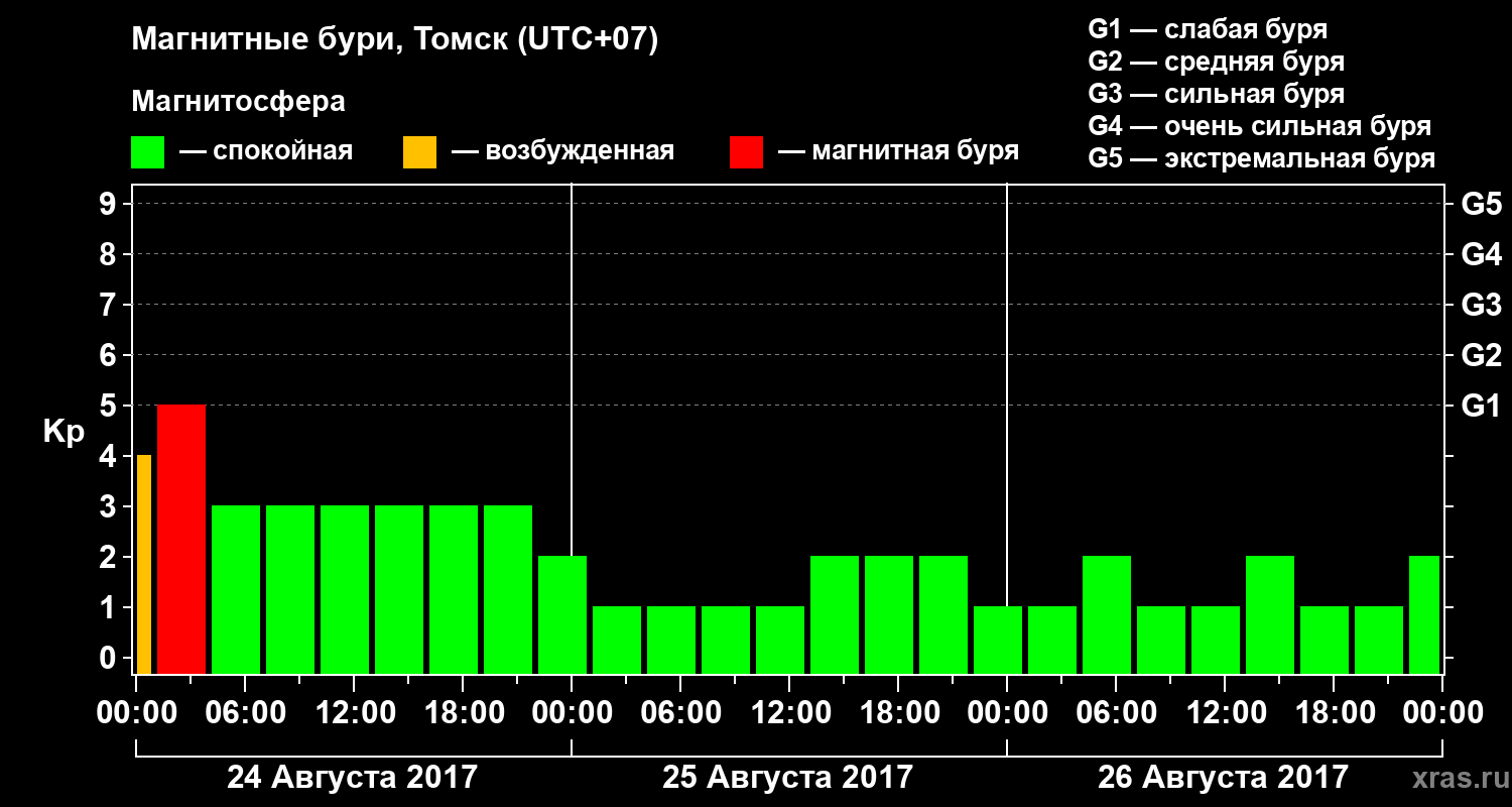 Изменения геомагнитного индекса Kp с 24 по 26 августа 2017 года для средних широт