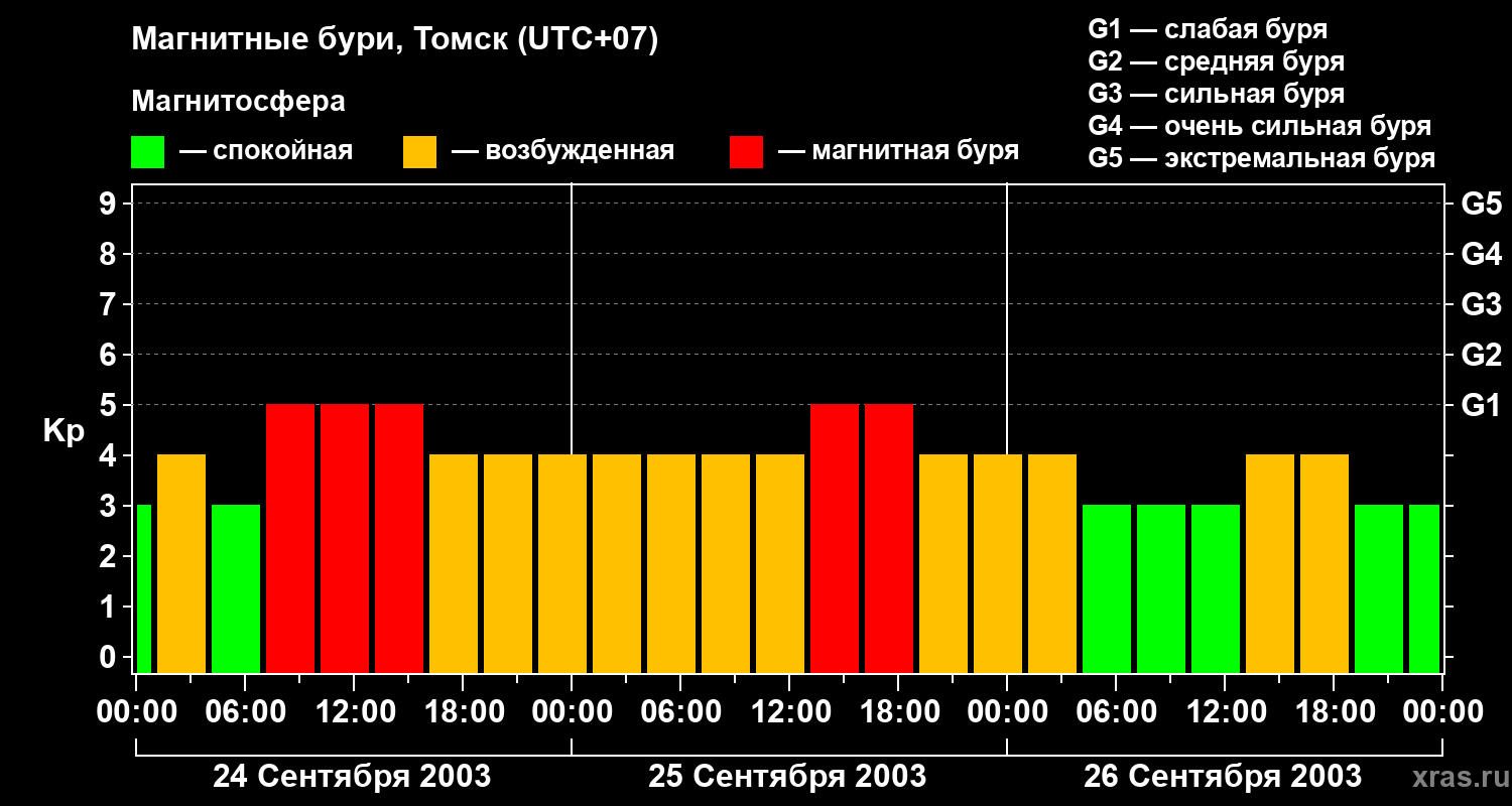 Изменения геомагнитного индекса Kp с 24 по 26 сентября 2003 года для средних широт