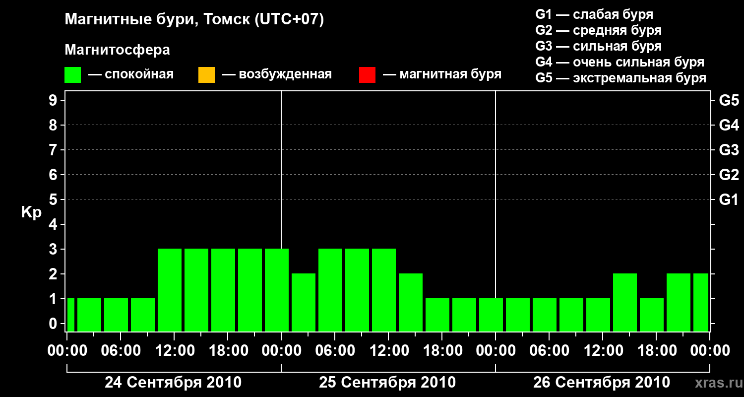 Изменения геомагнитного индекса Kp с 24 по 26 сентября 2010 года для средних широт