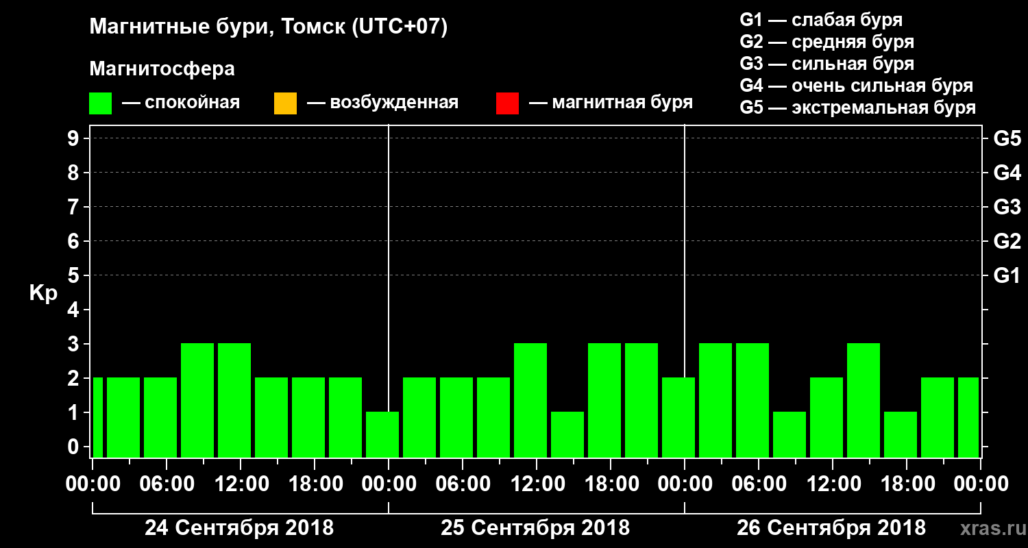 Изменения геомагнитного индекса Kp с 24 по 26 сентября 2018 года для средних широт