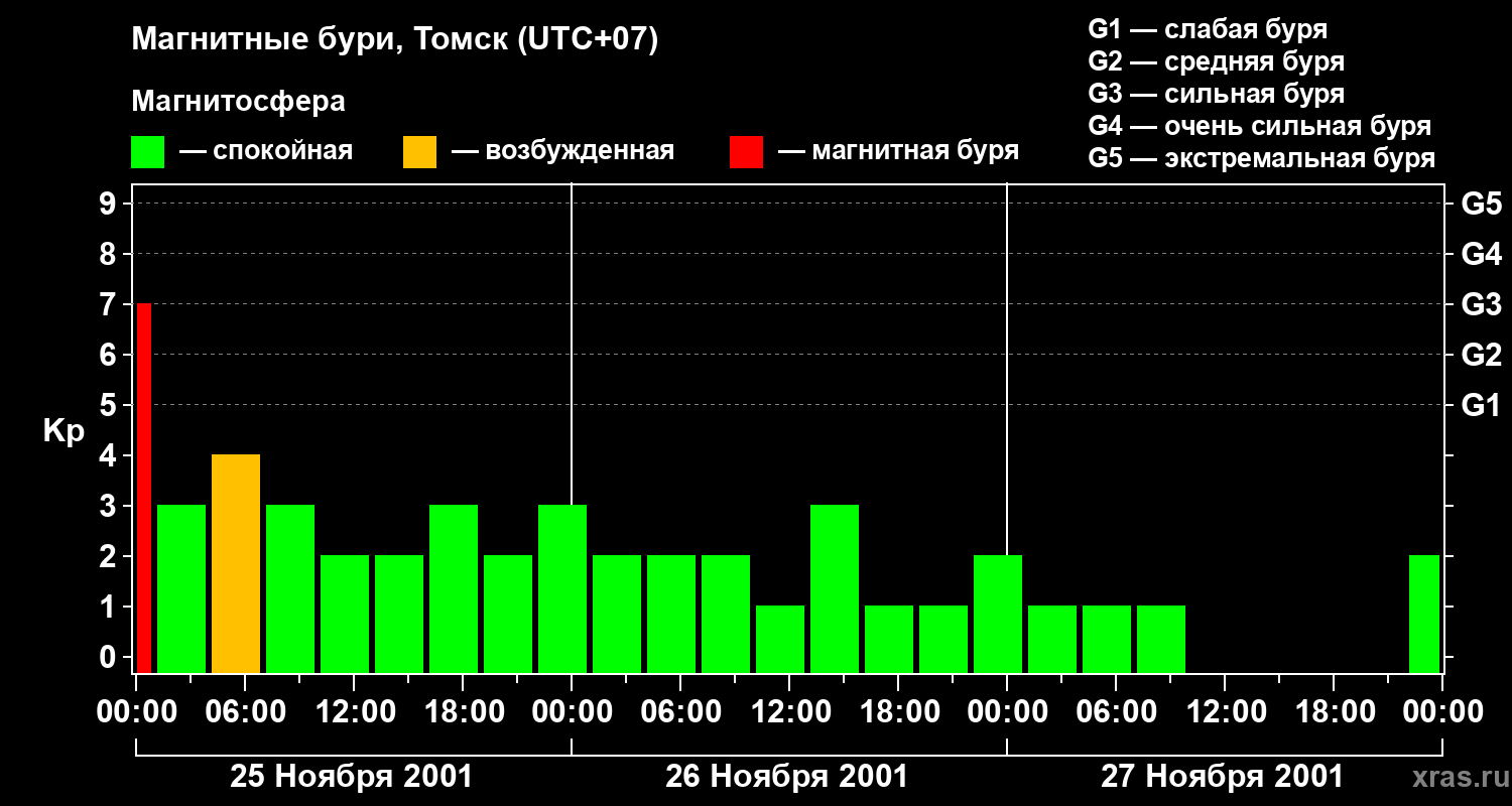 Изменения геомагнитного индекса Kp с 25 по 27 ноября 2001 года для средних широт