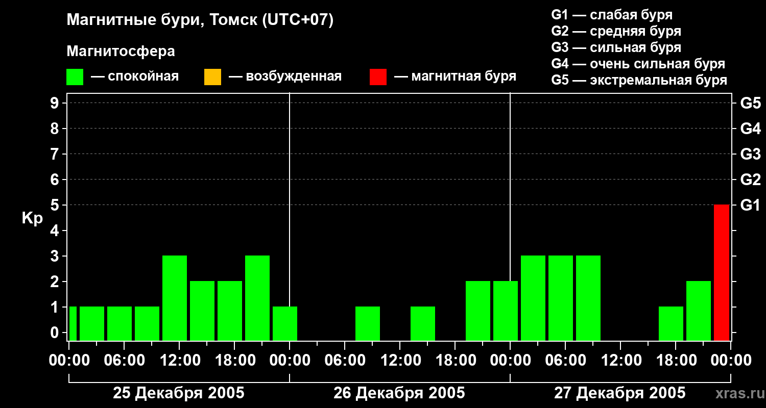 Изменения геомагнитного индекса Kp с 25 по 27 декабря 2005 года для средних широт