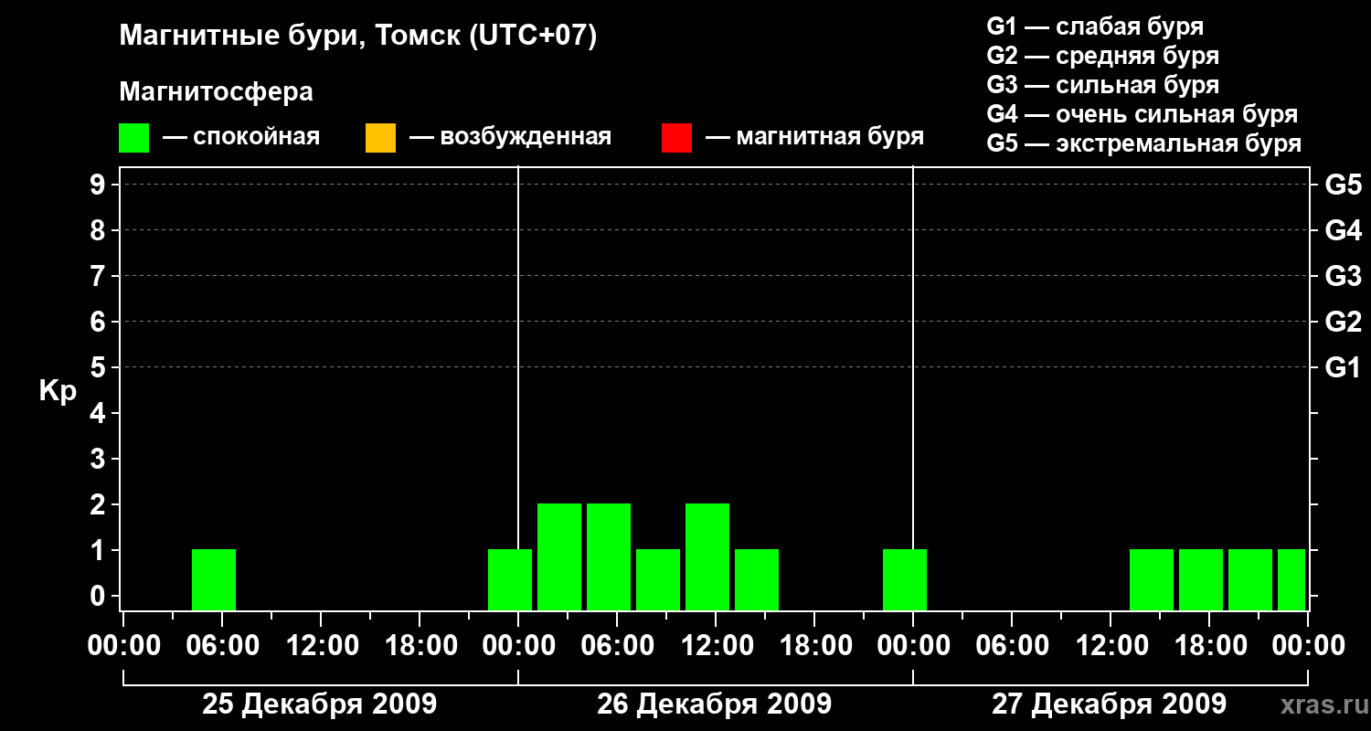 Изменения геомагнитного индекса Kp с 25 по 27 декабря 2009 года для средних широт