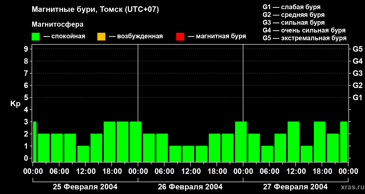 Изменения геомагнитного индекса Kp с 25 по 27 февраля 2004 года для средних широт