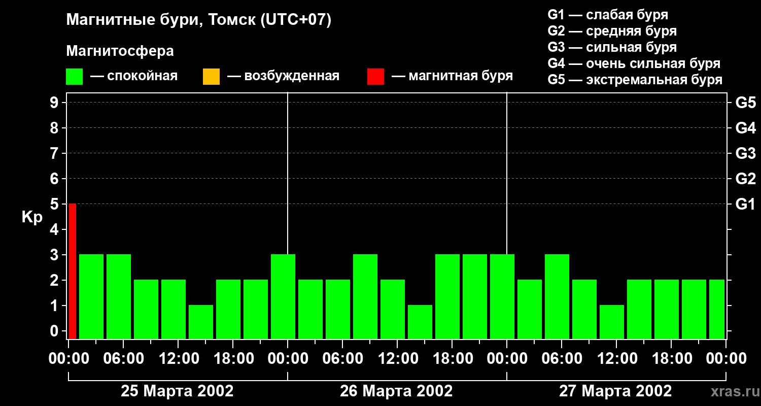 Изменения геомагнитного индекса Kp с 25 по 27 марта 2002 года для средних широт