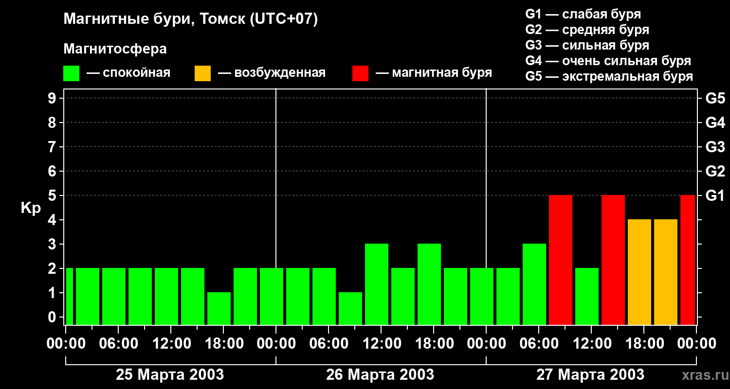 Изменения геомагнитного индекса Kp с 25 по 27 марта 2003 года для средних широт