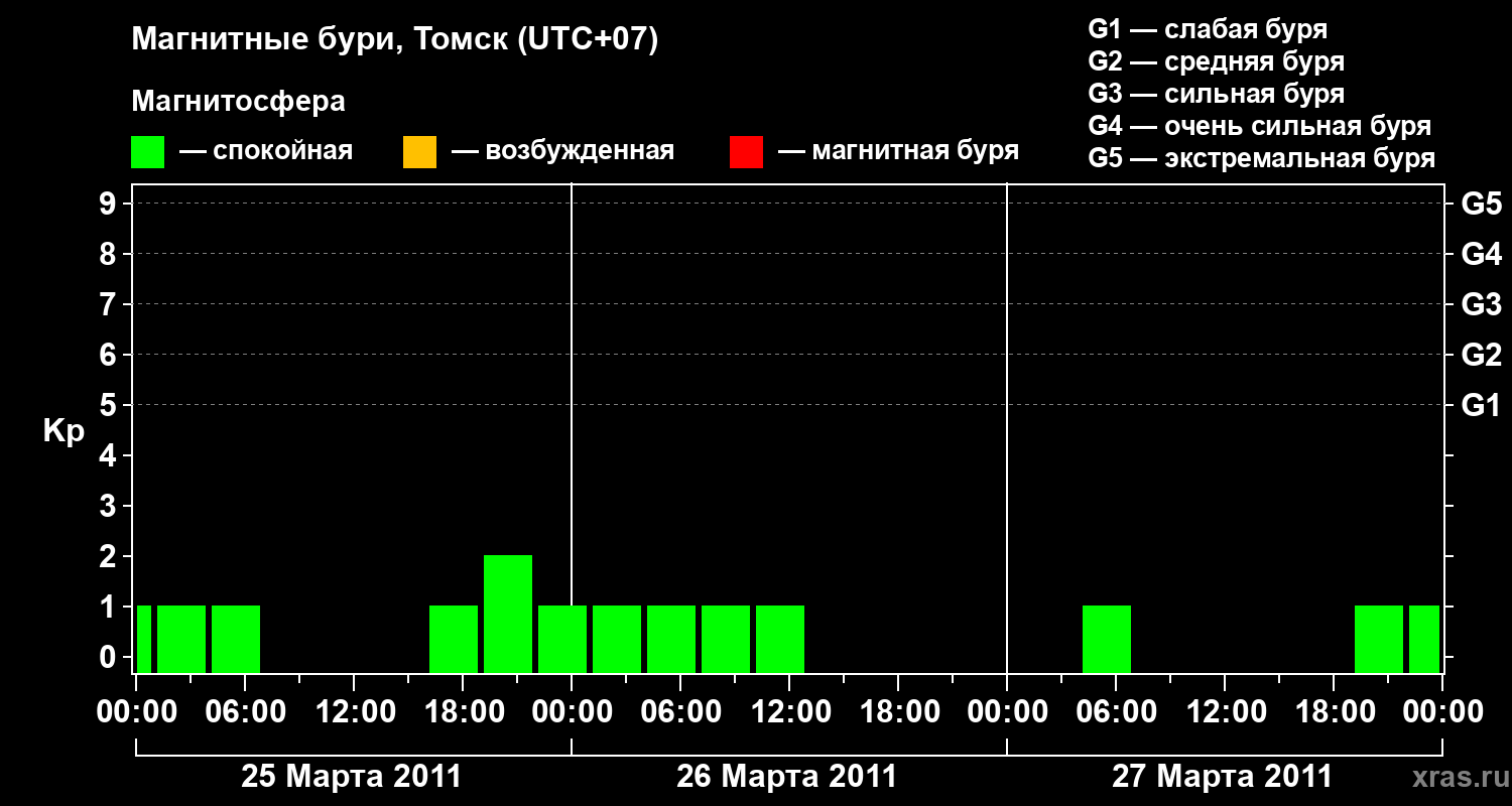 Изменения геомагнитного индекса Kp с 25 по 27 марта 2011 года для средних широт
