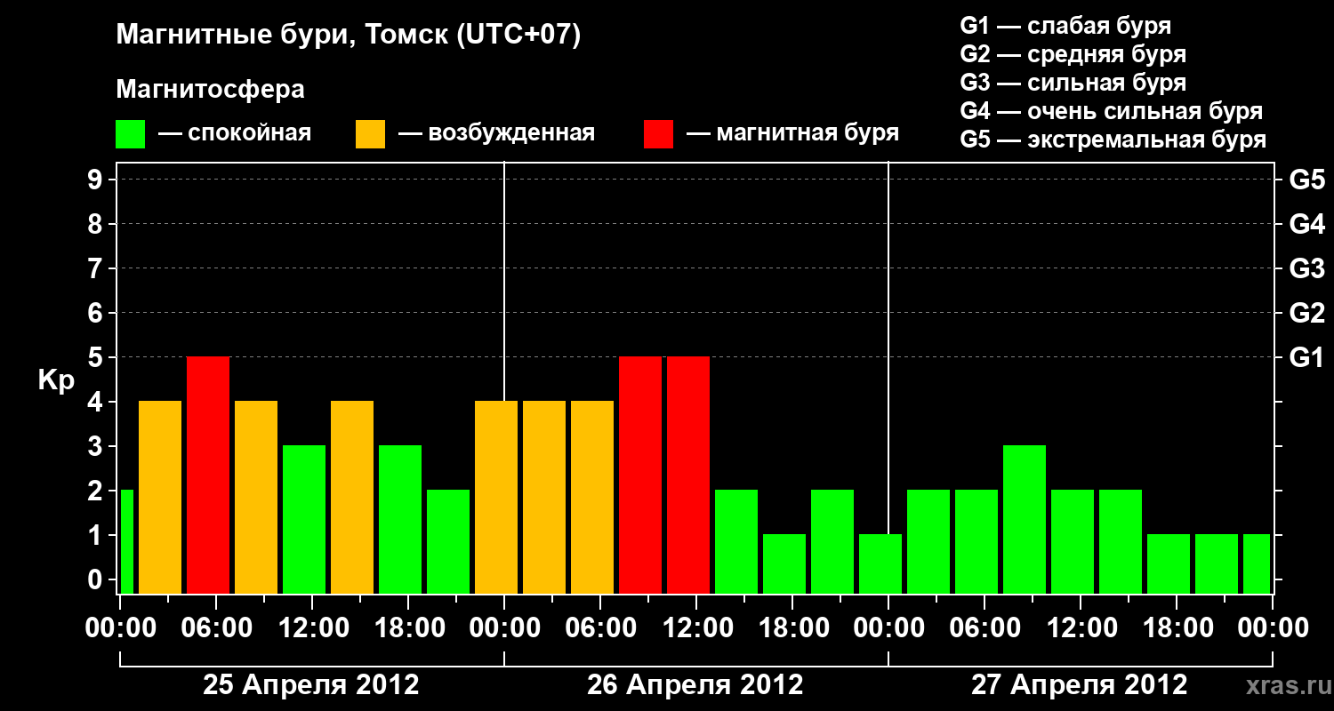 Изменения геомагнитного индекса Kp с 25 по 27 апреля 2012 года для средних широт