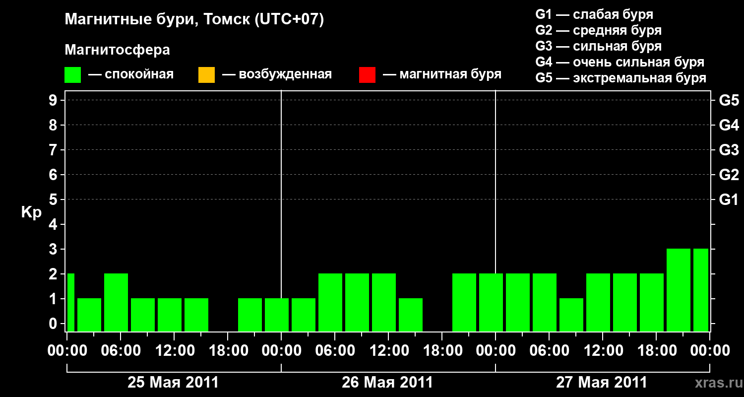 Изменения геомагнитного индекса Kp с 25 по 27 мая 2011 года для средних широт