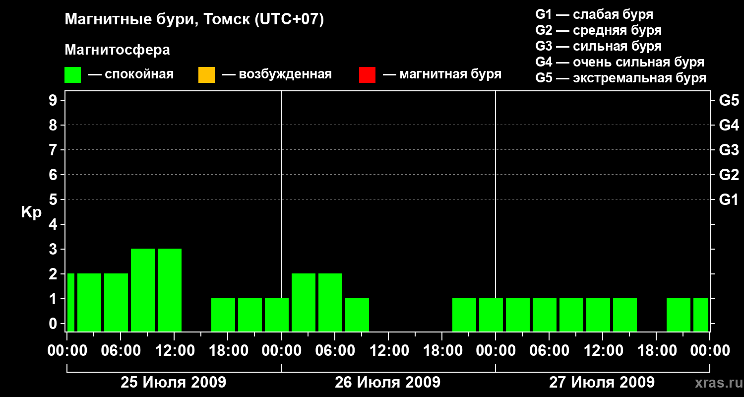 Изменения геомагнитного индекса Kp с 25 по 27 июля 2009 года для средних широт