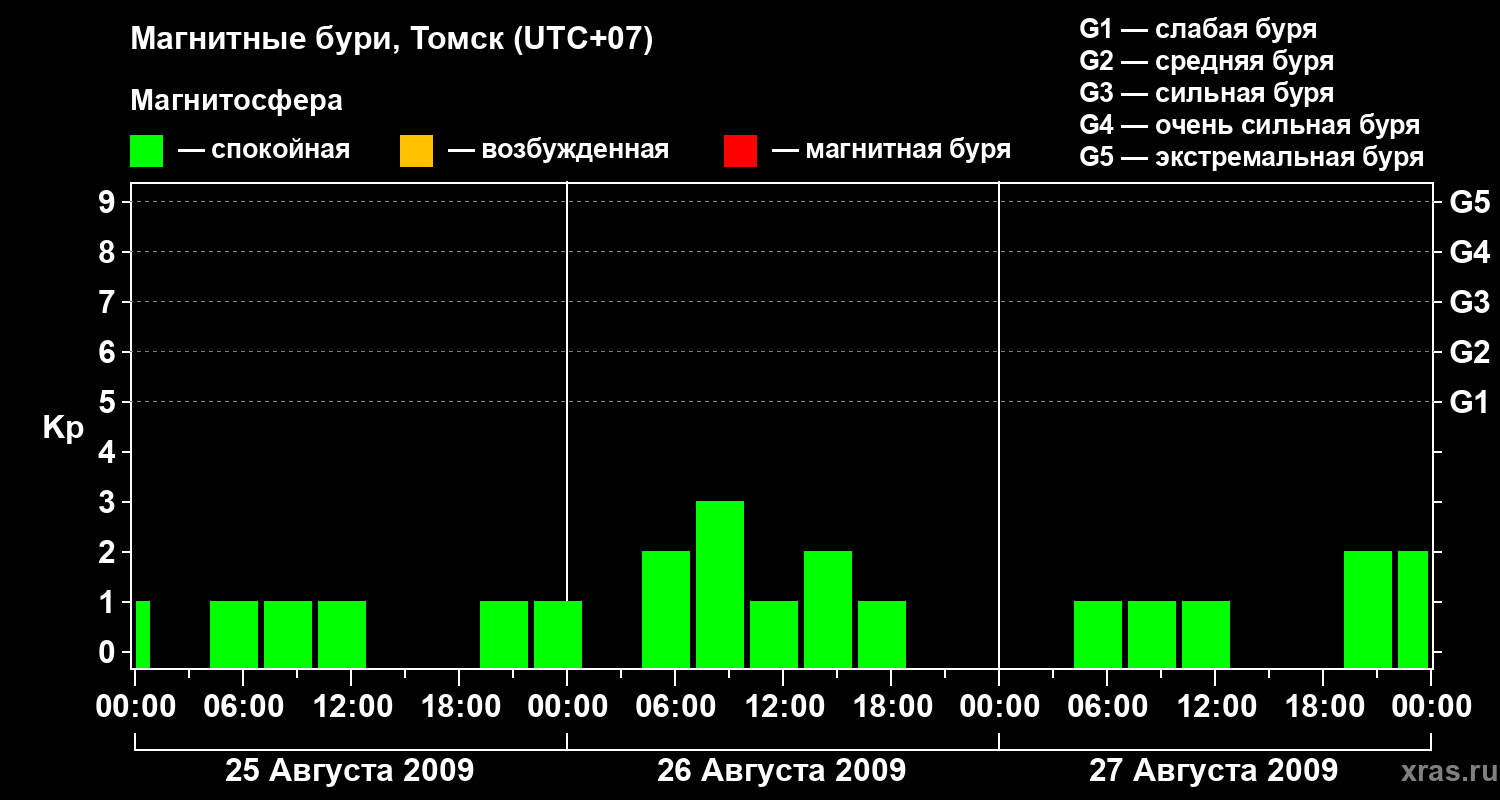 Изменения геомагнитного индекса Kp с 25 по 27 августа 2009 года для средних широт